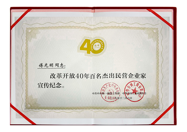 会上,国家领导为圣农公司董事长傅光明等100位杰出民营企业家颁发改革开放40年杰出民营企业家纪念章。