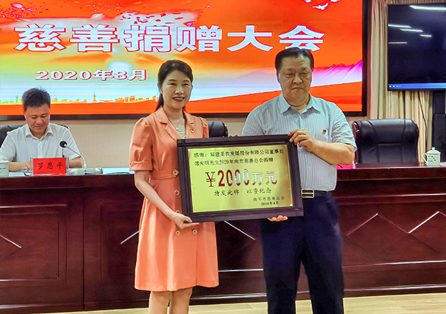 8月20日,南平市慈善捐赠大会在建阳举办,市委常委、统战部长庄莉,副市长罗恩平,南平市工商联主席、慈善总会会长、圣农集团创始人傅光明出席会议。
