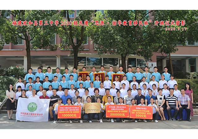 9月17日,2020级“思源·佑华教育移民班”在政和三中举办开班仪式。中华思源工程扶贫基金会副秘书长陶鸣,思源-佑华公益基金管委会主任、上海佑华实业发展有限公司总经理曹贞,民建福建省委社会服务处处长王凤玲,南平市政协副主席、科技局局长、民建南平市委会主委黄艳珠,政和县委常委、统战部部长苏久勤,圣农发展股份有限公司政和公司总经理李明哲等领导出席开班仪式。