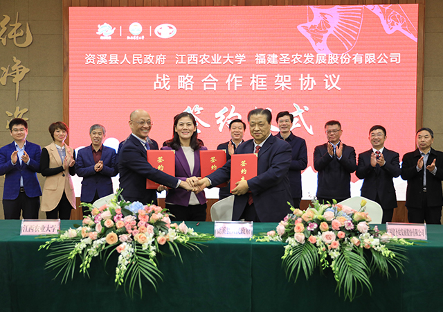 随后,资溪县政府、江西农业大学、圣农集团在资溪县大觉山国际酒店签订战略合作框架协议,三方将合力在资溪县打造出圣农集团第二个白羽肉鸡育种基地。