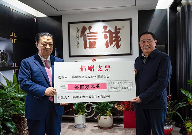 11月6日,圣农集团创始人傅光明向福建省公安民警英烈基金会捐赠300万元。福建省公安民警英烈基金会理事长李坚一行专程来到圣农集团,向集团创始人傅光明颁发荣誉理事长证书。